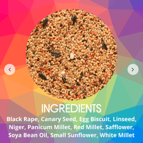 Black Rape, Canary Seed, Egg Biscuit, Linseed, Niger, Panicum Millet, Red Millet, Safflower, Soya Bean Oil, Small Sunflower, White Millet